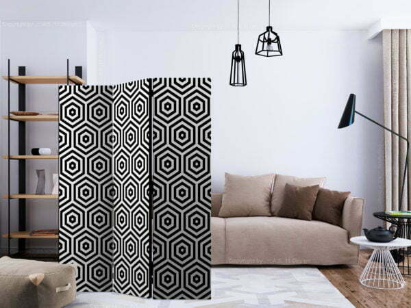 Dekoratives Paravent “Black and White Hypnosis [Room Dividers]” ist ein besonderes Schmuckstück für die modernen Inneräume. 3-teilig, hergestellt aus Holz und beidseitig bedrucktes Paravent teilt nicht nur diskret den Raum sonder kreiert auch in dem Raum ein fabelhaftes Arrangement.