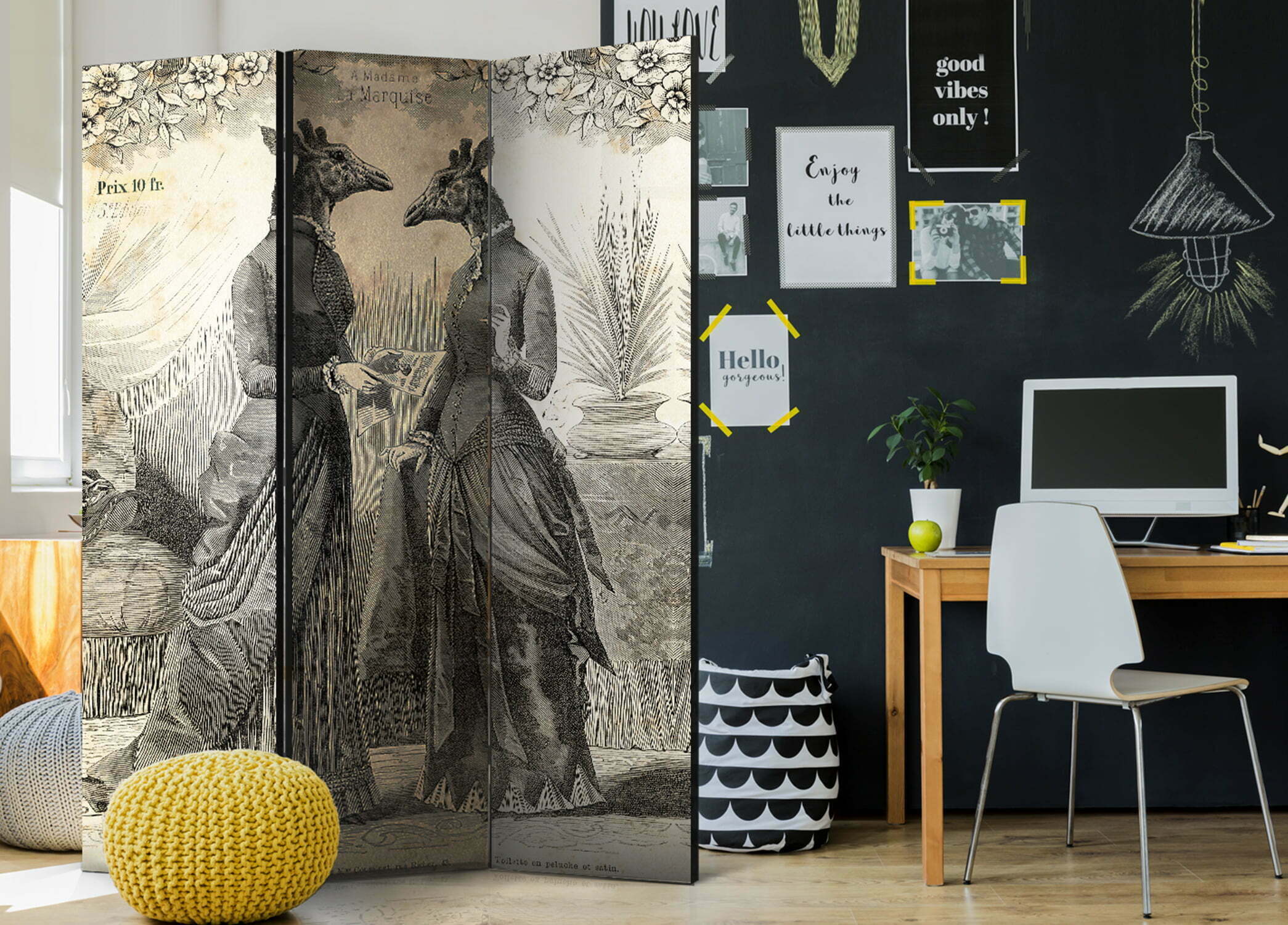 Dekoratives Paravent “Conversation [Room Dividers]” ist ein besonderes Schmuckstück für die modernen Inneräume. 3-teilig, hergestellt aus Holz und beidseitig bedrucktes Paravent teilt nicht nur diskret den Raum sonder kreiert auch in dem Raum ein fabelhaftes Arrangement.