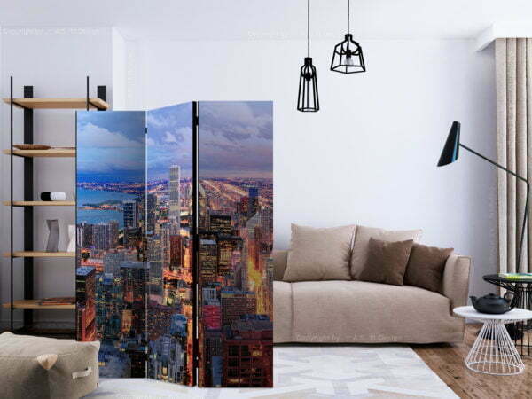 Dekoratives Paravent “Illuminated Chicago [Room Dividers]” ist ein besonderes Schmuckstück für die modernen Inneräume. 3-teilig, hergestellt aus Holz und beidseitig bedrucktes Paravent teilt nicht nur diskret den Raum sonder kreiert auch in dem Raum ein fabelhaftes Arrangement.