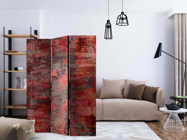 Dekoratives Paravent “Red Metal [Room Dividers]” ist ein besonderes Schmuckstück für die modernen Inneräume. 3-teilig, hergestellt aus Holz und beidseitig bedrucktes Paravent teilt nicht nur diskret den Raum sonder kreiert auch in dem Raum ein fabelhaftes Arrangement.