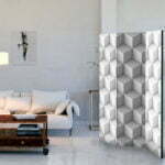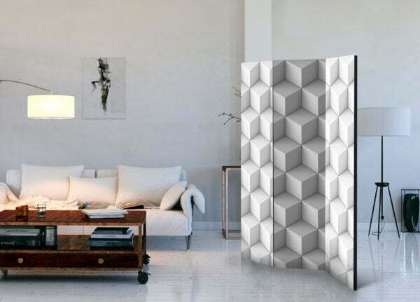 Dekoratives Paravent “Room divider – Cube I” ist ein besonderes Schmuckstück für die modernen Inneräume. 3-teilig, hergestellt aus Holz und beidseitig bedrucktes Paravent teilt nicht nur diskret den Raum sonder kreiert auch in dem Raum ein fabelhaftes Arrangement.