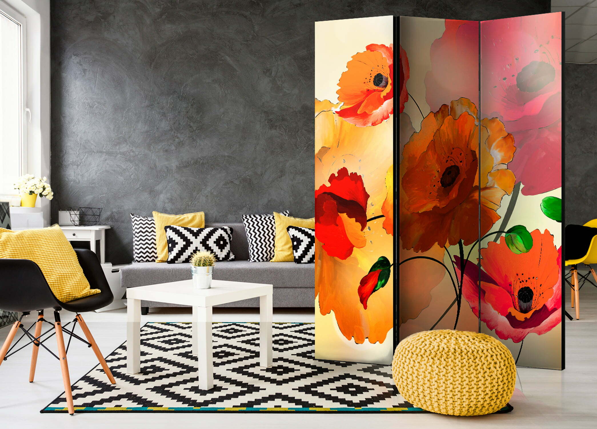 Dekoratives Paravent “Velvet Poppies [Room Dividers]” ist ein besonderes Schmuckstück für die modernen Inneräume. 3-teilig, hergestellt aus Holz und beidseitig bedrucktes Paravent teilt nicht nur diskret den Raum sonder kreiert auch in dem Raum ein fabelhaftes Arrangement. Perfekte Herstellung sowie originelle Motive in der Full HD Druckqualität verursachen, dass die Zimmerparavents jedem Raum einen einmaligen Charme verleihen. Die dekorativen Paravents für die Wohnung, dass ist mit Sicherheit eine originelle Idee für die Dekoration des Innenraumes. Es lohnt sich ihre praktische Anwendung zu erwähnen – die Zimmerparavents kann man z.B. zwecks der Kachierung des Wäschetrockners nutzen. Das Paravent ist eine sehr originelle Dekoration von Räumen, die man nutzen kann, sowohl in der Wohnung wie auch in einem Atelier z.B. im Friseursalon, Arztpraxis oder im Buchhaltungsbüro.