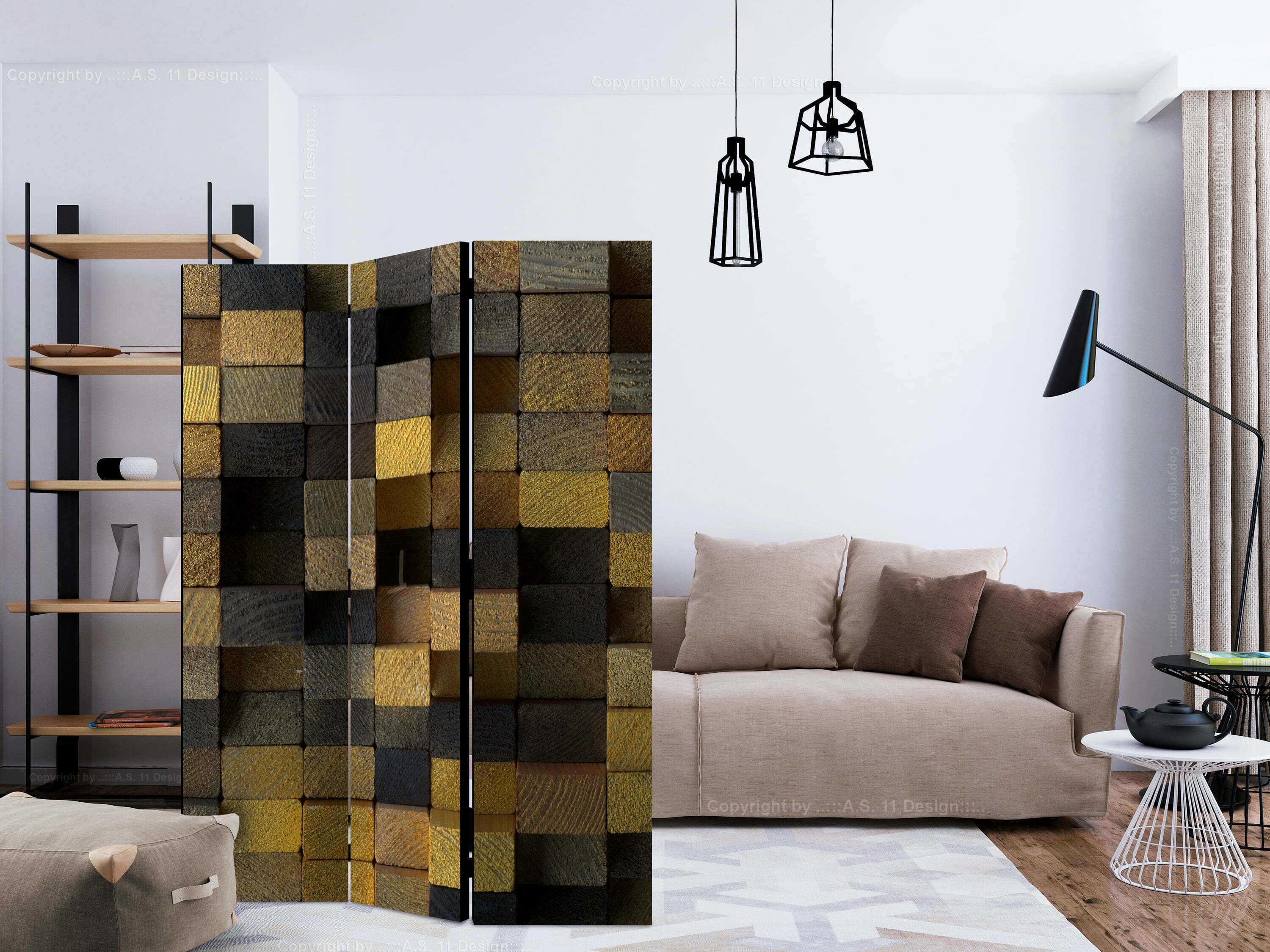 3-teiliges Paravent – Wooden cubes [Room Dividers]