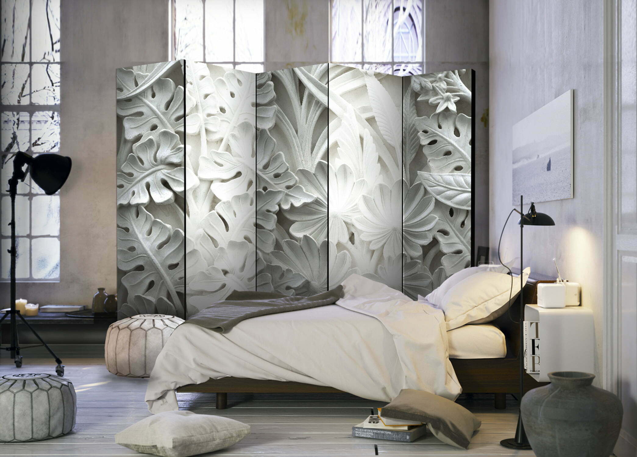 Dekoratives Paravent “Alabaster Garden II [Room Dividers]” ist ein besonderes Schmuckstück für die modernen Inneräume. 5-teilig, hergestellt aus Holz und beidseitig bedrucktes Paravent teilt nicht nur diskret den Raum sonder kreiert auch in dem Raum ein fabelhaftes Arrangement. Perfekte Herstellung sowie originelle Motive in der Full HD Druckqualität verursachen, dass die Zimmerparavents jedem Raum einen einmaligen Charme verleihen. Die dekorativen Paravents für die Wohnung, dass ist mit Sicherheit eine originelle Idee für die Dekoration des Innenraumes. Es lohnt sich ihre praktische Anwendung zu erwähnen – die Zimmerparavents kann man z.B. zwecks der Kachierung des Wäschetrockners nutzen. Das Paravent ist eine sehr originelle Dekoration von Räumen, die man nutzen kann, sowohl in der Wohnung wie auch in einem Atelier z.B. im Friseursalon, Arztpraxis oder im Buchhaltungsbüro.