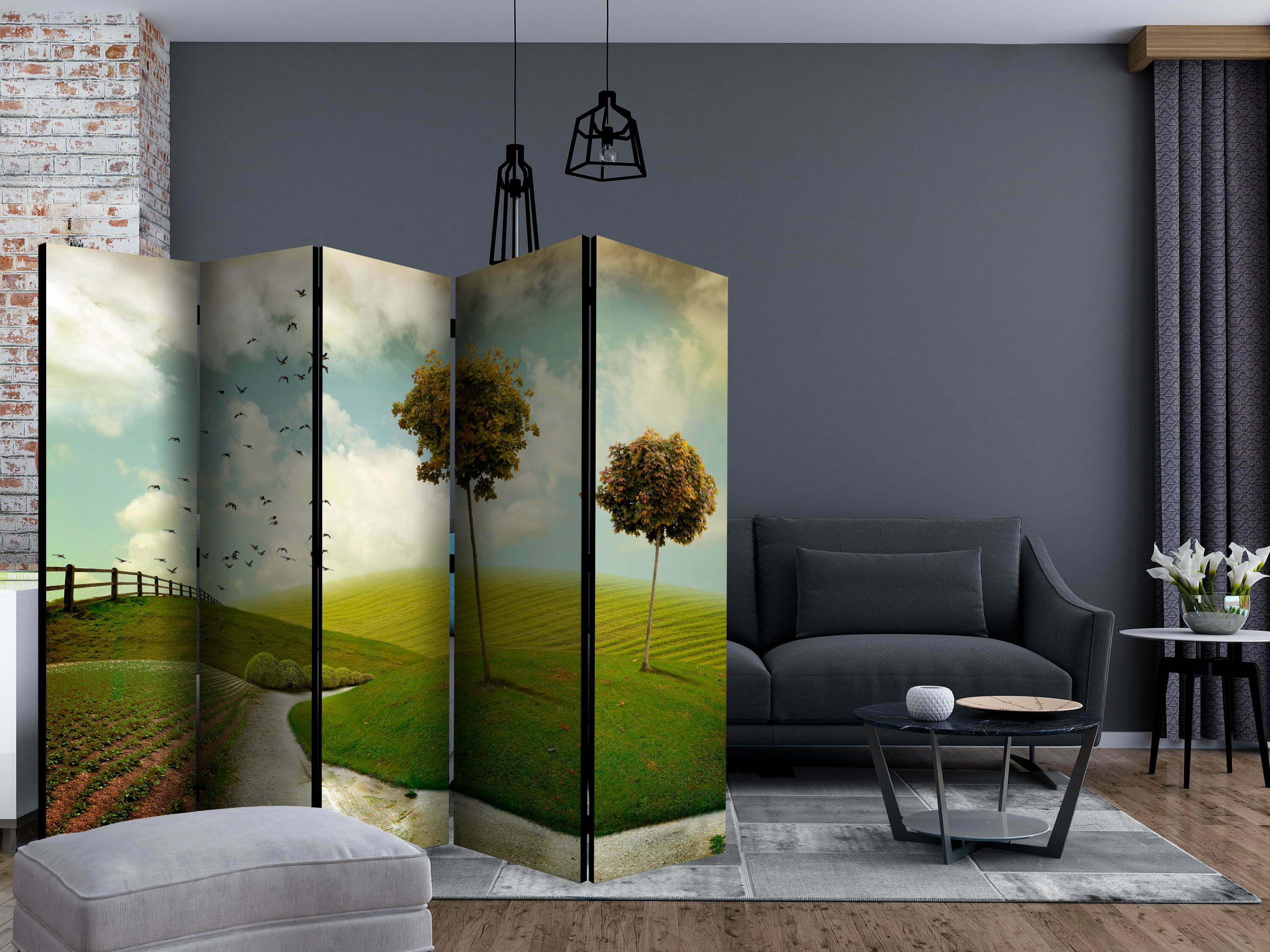 Dekoratives Paravent “autumn – landscape II [Room Dividers]” ist ein besonderes Schmuckstück für die modernen Inneräume. 5-teilig, hergestellt aus Holz und beidseitig bedrucktes Paravent teilt nicht nur diskret den Raum sonder kreiert auch in dem Raum ein fabelhaftes Arrangement.