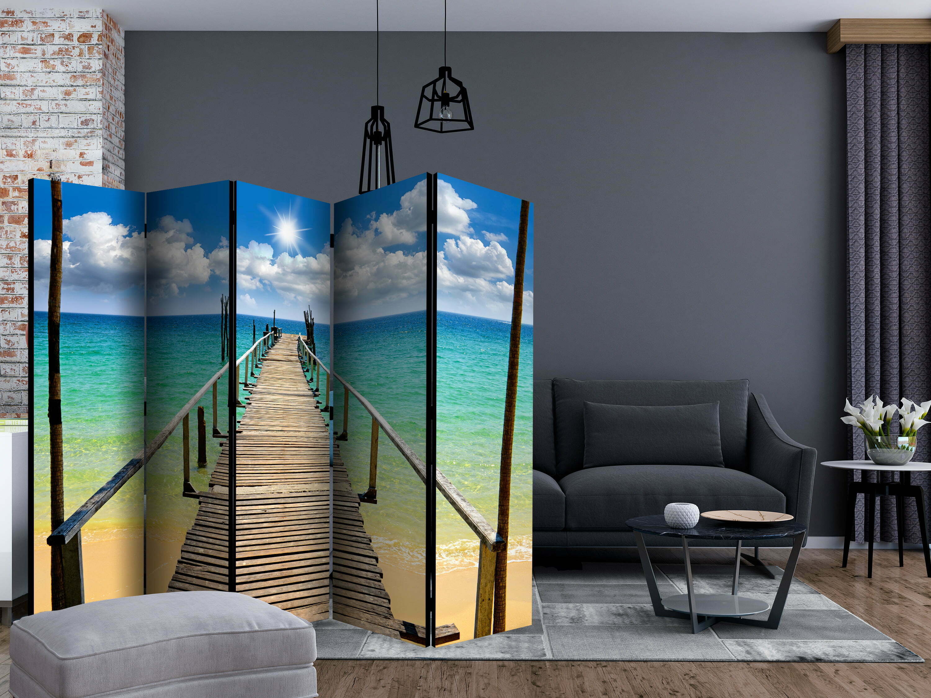 Dekoratives Paravent “Beach, sun, bridge II [Room Dividers]” ist ein besonderes Schmuckstück für die modernen Inneräume. 5-teilig, hergestellt aus Holz und beidseitig bedrucktes Paravent teilt nicht nur diskret den Raum sonder kreiert auch in dem Raum ein fabelhaftes Arrangement.