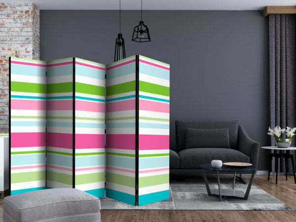 Dekoratives Paravent “Bright stripes II [Room Dividers]” ist ein besonderes Schmuckstück für die modernen Inneräume. 5-teilig, hergestellt aus Holz und beidseitig bedrucktes Paravent teilt nicht nur diskret den Raum sonder kreiert auch in dem Raum ein fabelhaftes Arrangement. Perfekte Herstellung sowie originelle Motive in der Full HD Druckqualität verursachen, dass die Zimmerparavents jedem Raum einen einmaligen Charme verleihen. Die dekorativen Paravents für die Wohnung, dass ist mit Sicherheit eine originelle Idee für die Dekoration des Innenraumes. Es lohnt sich ihre praktische Anwendung zu erwähnen – die Zimmerparavents kann man z.B. zwecks der Kachierung des Wäschetrockners nutzen. Das Paravent ist eine sehr originelle Dekoration von Räumen, die man nutzen kann, sowohl in der Wohnung wie auch in einem Atelier z.B. im Friseursalon, Arztpraxis oder im Buchhaltungsbüro.