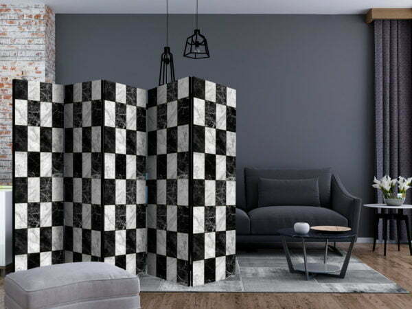 Dekoratives Paravent “Checker II [Room Dividers]” ist ein besonderes Schmuckstück für die modernen Inneräume. 5-teilig, hergestellt aus Holz und beidseitig bedrucktes Paravent teilt nicht nur diskret den Raum sonder kreiert auch in dem Raum ein fabelhaftes Arrangement. Perfekte Herstellung sowie originelle Motive in der Full HD Druckqualität verursachen, dass die Zimmerparavents jedem Raum einen einmaligen Charme verleihen. Die dekorativen Paravents für die Wohnung, dass ist mit Sicherheit eine originelle Idee für die Dekoration des Innenraumes. Es lohnt sich ihre praktische Anwendung zu erwähnen – die Zimmerparavents kann man z.B. zwecks der Kachierung des Wäschetrockners nutzen. Das Paravent ist eine sehr originelle Dekoration von Räumen, die man nutzen kann, sowohl in der Wohnung wie auch in einem Atelier z.B. im Friseursalon, Arztpraxis oder im Buchhaltungsbüro.