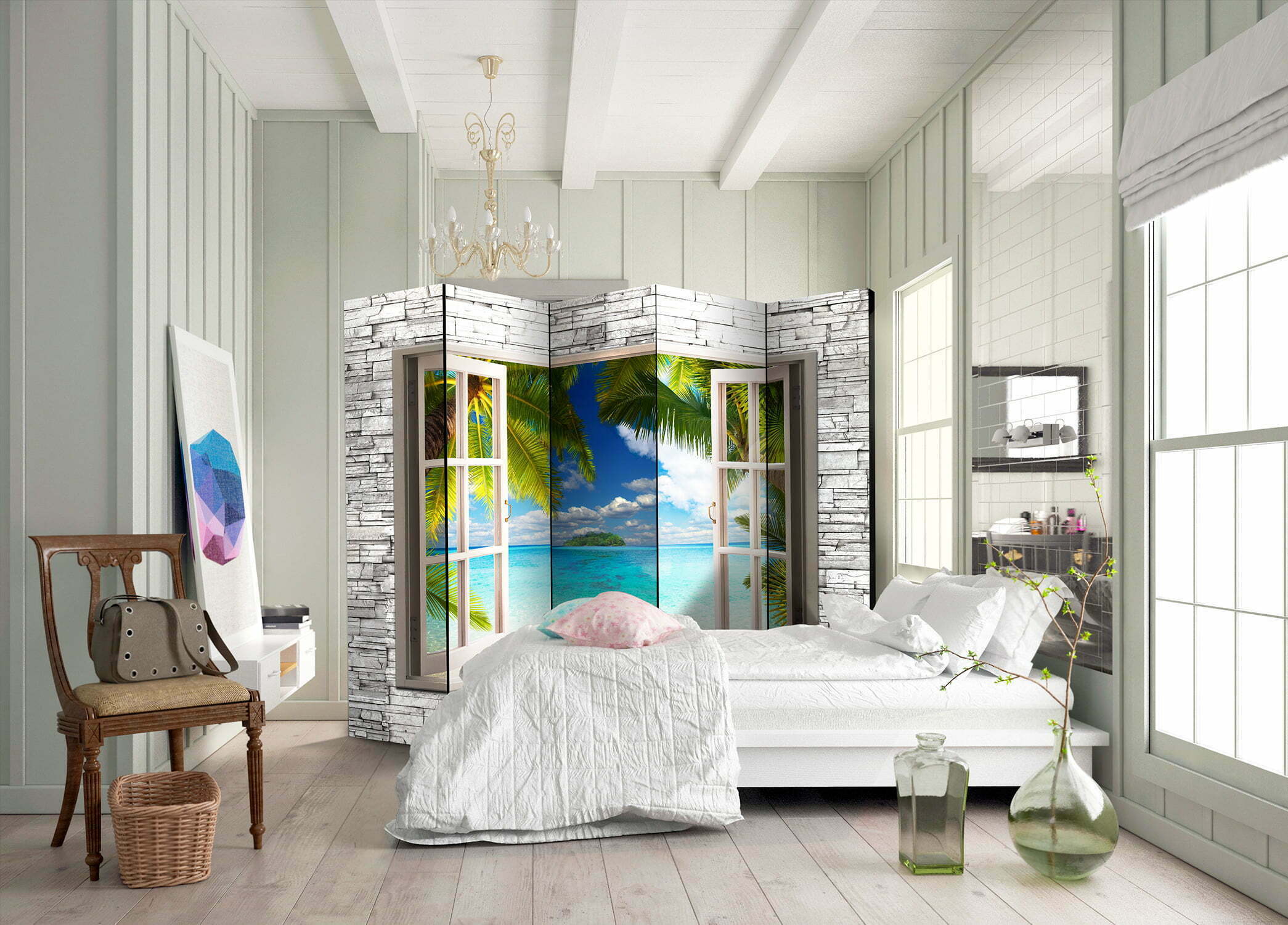 Dekoratives Paravent “Dream Island II [Room Dividers]” ist ein besonderes Schmuckstück für die modernen Inneräume. 5-teilig, hergestellt aus Holz und beidseitig bedrucktes Paravent teilt nicht nur diskret den Raum sonder kreiert auch in dem Raum ein fabelhaftes Arrangement. Perfekte Herstellung sowie originelle Motive in der Full HD Druckqualität verursachen, dass die Zimmerparavents jedem Raum einen einmaligen Charme verleihen. Die dekorativen Paravents für die Wohnung, dass ist mit Sicherheit eine originelle Idee für die Dekoration des Innenraumes. Es lohnt sich ihre praktische Anwendung zu erwähnen – die Zimmerparavents kann man z.B. zwecks der Kachierung des Wäschetrockners nutzen. Das Paravent ist eine sehr originelle Dekoration von Räumen, die man nutzen kann, sowohl in der Wohnung wie auch in einem Atelier z.B. im Friseursalon, Arztpraxis oder im Buchhaltungsbüro.
