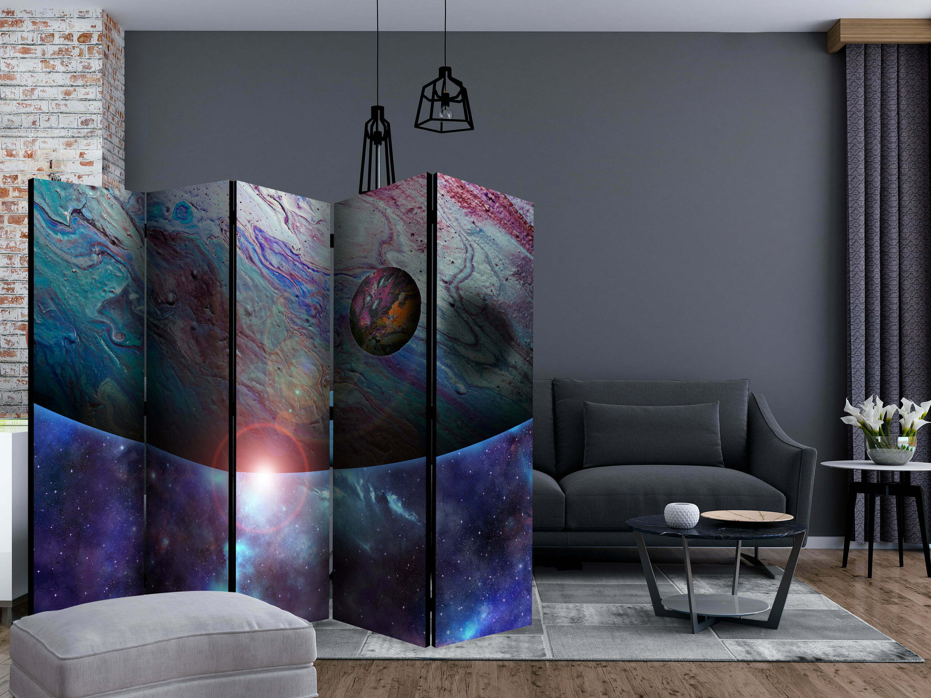 Dekoratives Paravent “In Orbit II [Room Dividers]” ist ein besonderes Schmuckstück für die modernen Inneräume. 5-teilig, hergestellt aus Holz und beidseitig bedrucktes Paravent teilt nicht nur diskret den Raum sonder kreiert auch in dem Raum ein fabelhaftes Arrangement. Perfekte Herstellung sowie originelle Motive in der Full HD Druckqualität verursachen, dass die Zimmerparavents jedem Raum einen einmaligen Charme verleihen. Die dekorativen Paravents für die Wohnung, dass ist mit Sicherheit eine originelle Idee für die Dekoration des Innenraumes. Es lohnt sich ihre praktische Anwendung zu erwähnen – die Zimmerparavents kann man z.B. zwecks der Kachierung des Wäschetrockners nutzen. Das Paravent ist eine sehr originelle Dekoration von Räumen, die man nutzen kann, sowohl in der Wohnung wie auch in einem Atelier z.B. im Friseursalon, Arztpraxis oder im Buchhaltungsbüro.