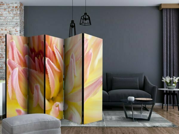 Dekoratives Paravent “Pastel colored dahlia flower with dew drops II [Room Dividers]” ist ein besonderes Schmuckstück für die modernen Inneräume. 5-teilig, hergestellt aus Holz und beidseitig bedrucktes Paravent teilt nicht nur diskret den Raum sonder kreiert auch in dem Raum ein fabelhaftes Arrangement.