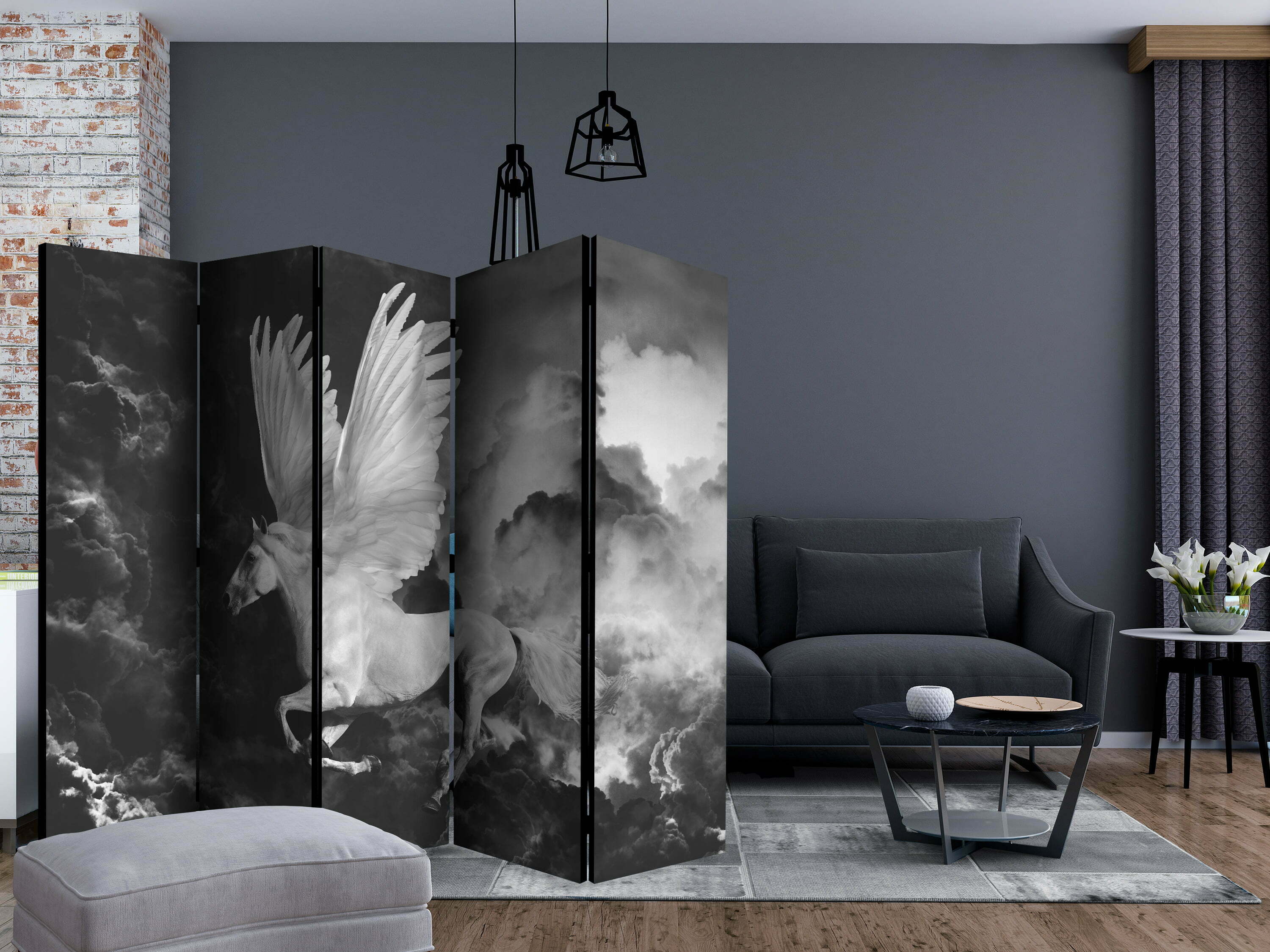 Dekoratives Paravent “Pegasus on the way to Mount Olympus II [Room Dividers]” ist ein besonderes Schmuckstück für die modernen Inneräume. 5-teilig, hergestellt aus Holz und beidseitig bedrucktes Paravent teilt nicht nur diskret den Raum sonder kreiert auch in dem Raum ein fabelhaftes Arrangement.