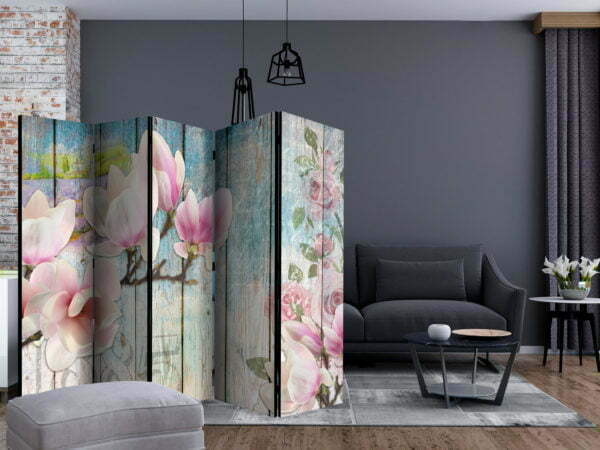 Dekoratives Paravent “Pink Flowers on Wood II [Room Dividers]” ist ein besonderes Schmuckstück für die modernen Inneräume. 5-teilig, hergestellt aus Holz und beidseitig bedrucktes Paravent teilt nicht nur diskret den Raum sonder kreiert auch in dem Raum ein fabelhaftes Arrangement.