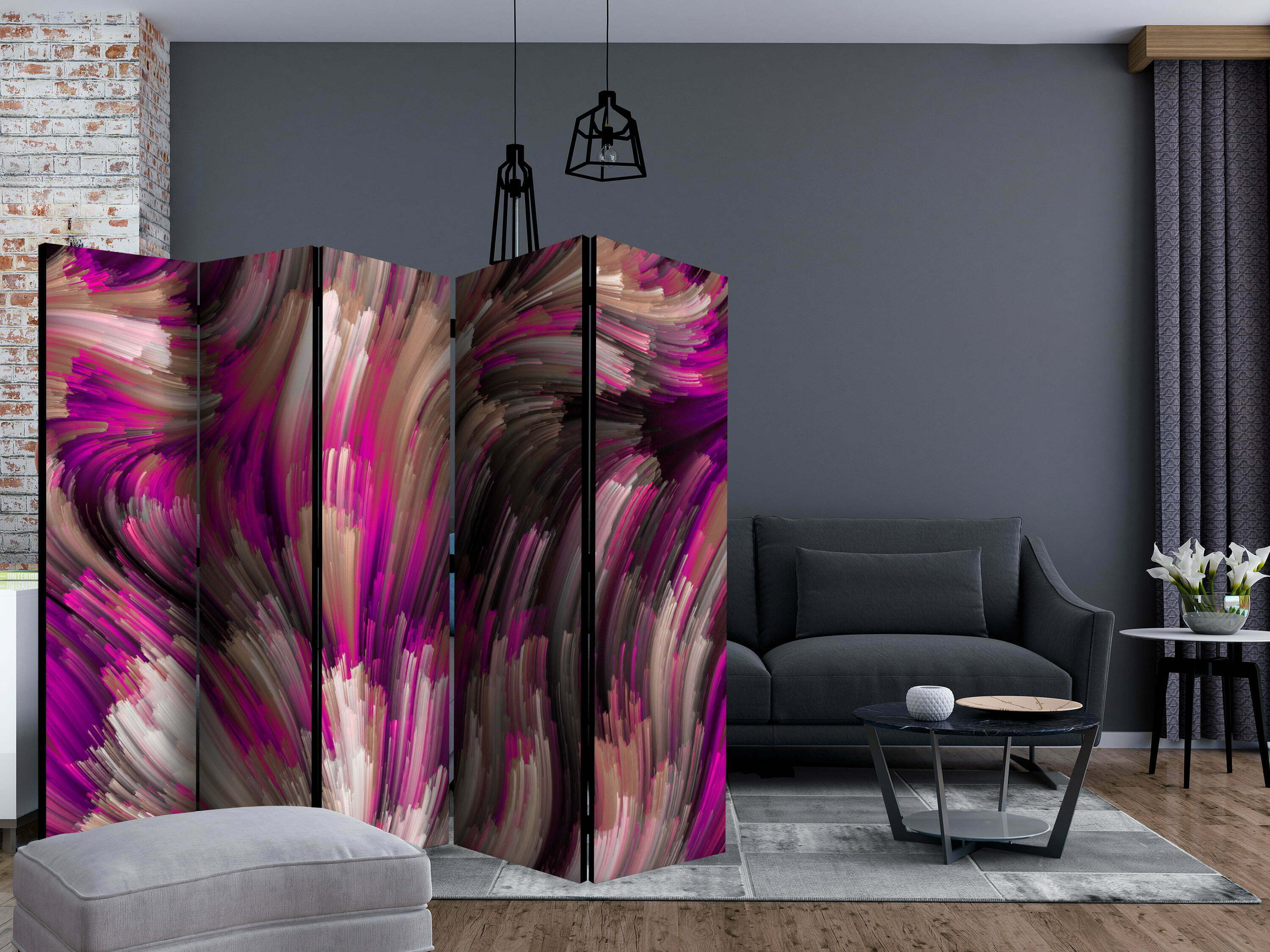 Dekoratives Paravent “Purple Energy II [Room Dividers]” ist ein besonderes Schmuckstück für die modernen Inneräume. 5-teilig, hergestellt aus Holz und beidseitig bedrucktes Paravent teilt nicht nur diskret den Raum sonder kreiert auch in dem Raum ein fabelhaftes Arrangement. Perfekte Herstellung sowie originelle Motive in der Full HD Druckqualität verursachen, dass die Zimmerparavents jedem Raum einen einmaligen Charme verleihen. Die dekorativen Paravents für die Wohnung, dass ist mit Sicherheit eine originelle Idee für die Dekoration des Innenraumes. Es lohnt sich ihre praktische Anwendung zu erwähnen – die Zimmerparavents kann man z.B. zwecks der Kachierung des Wäschetrockners nutzen. Das Paravent ist eine sehr originelle Dekoration von Räumen, die man nutzen kann, sowohl in der Wohnung wie auch in einem Atelier z.B. im Friseursalon, Arztpraxis oder im Buchhaltungsbüro.