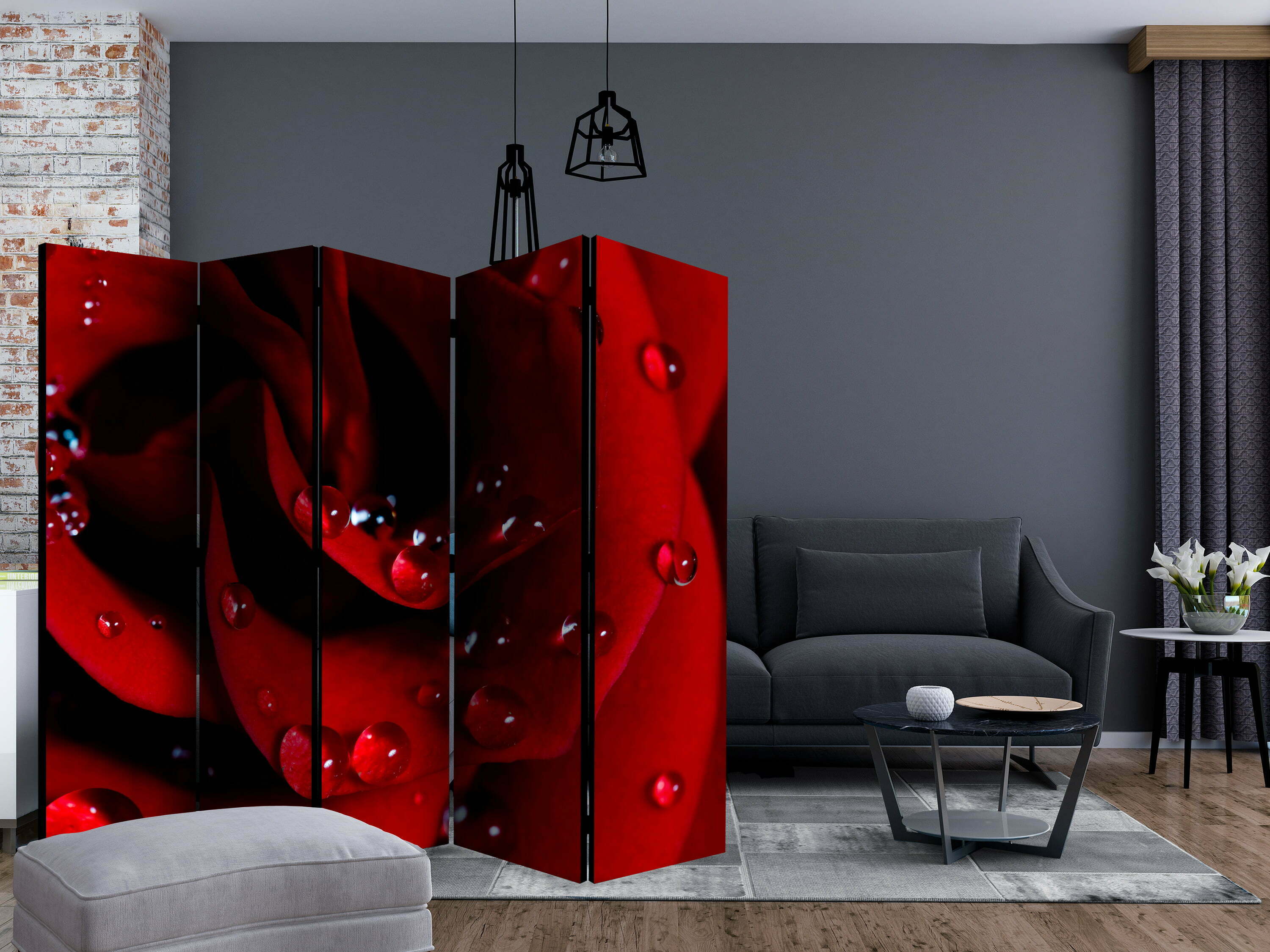 Dekoratives Paravent “Red rose with water drops II [Room Dividers]” ist ein besonderes Schmuckstück für die modernen Inneräume. 5-teilig, hergestellt aus Holz und beidseitig bedrucktes Paravent teilt nicht nur diskret den Raum sonder kreiert auch in dem Raum ein fabelhaftes Arrangement. Perfekte Herstellung sowie originelle Motive in der Full HD Druckqualität verursachen, dass die Zimmerparavents jedem Raum einen einmaligen Charme verleihen. Die dekorativen Paravents für die Wohnung, dass ist mit Sicherheit eine originelle Idee für die Dekoration des Innenraumes. Es lohnt sich ihre praktische Anwendung zu erwähnen – die Zimmerparavents kann man z.B. zwecks der Kachierung des Wäschetrockners nutzen. Das Paravent ist eine sehr originelle Dekoration von Räumen, die man nutzen kann, sowohl in der Wohnung wie auch in einem Atelier z.B. im Friseursalon, Arztpraxis oder im Buchhaltungsbüro.