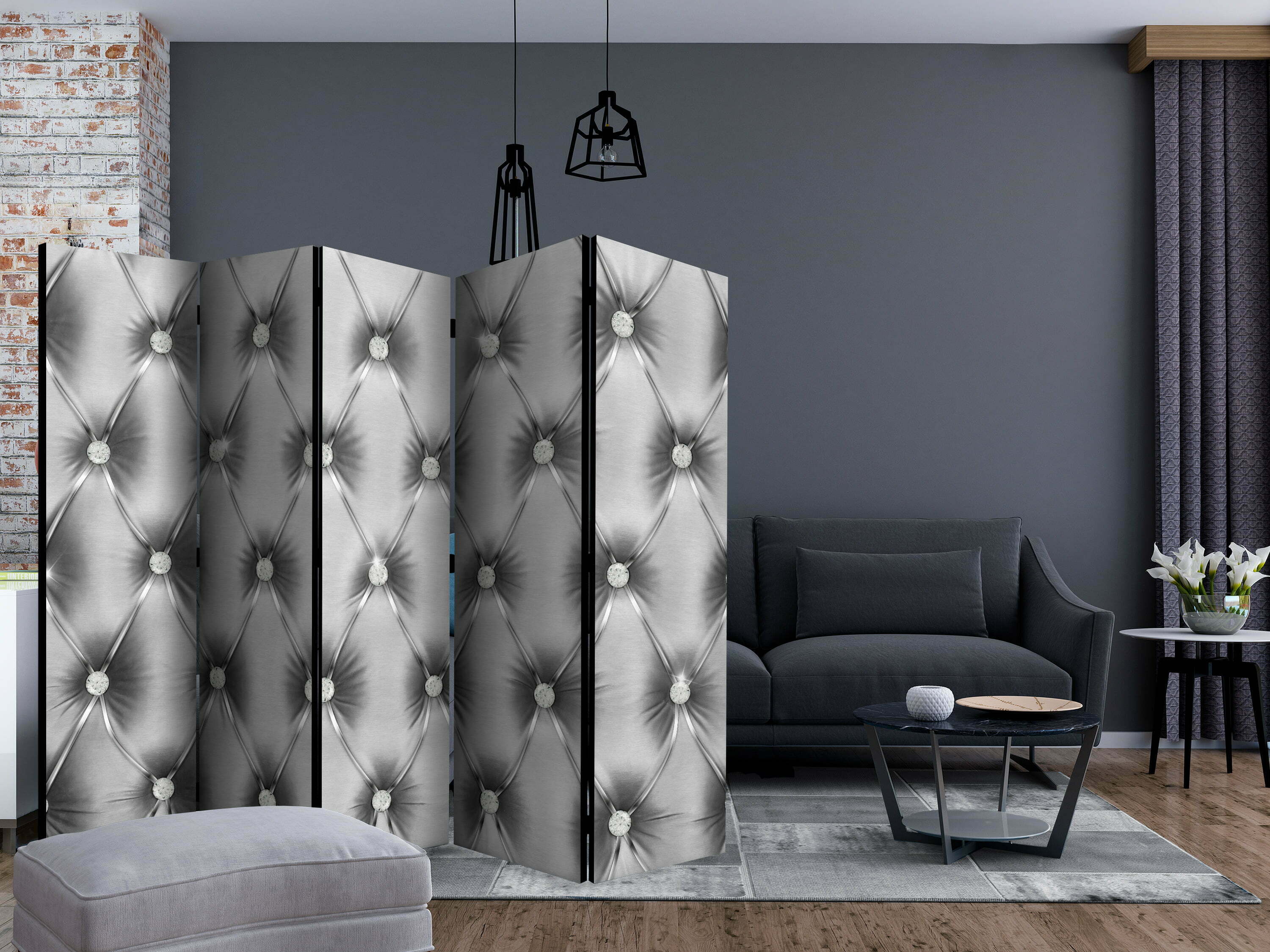 Dekoratives Paravent “Silver Luxury II [Room Dividers]” ist ein besonderes Schmuckstück für die modernen Inneräume. 5-teilig, hergestellt aus Holz und beidseitig bedrucktes Paravent teilt nicht nur diskret den Raum sonder kreiert auch in dem Raum ein fabelhaftes Arrangement.