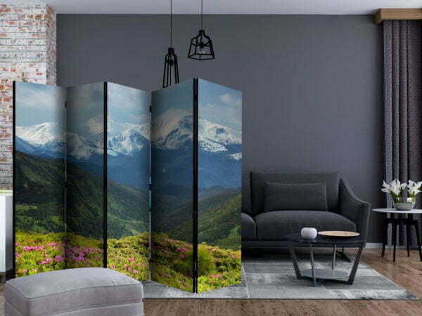 Dekoratives Paravent “Spring mountain landscape II [Room Dividers]” ist ein besonderes Schmuckstück für die modernen Inneräume. 5-teilig, hergestellt aus Holz und beidseitig bedrucktes Paravent teilt nicht nur diskret den Raum sonder kreiert auch in dem Raum ein fabelhaftes Arrangement.