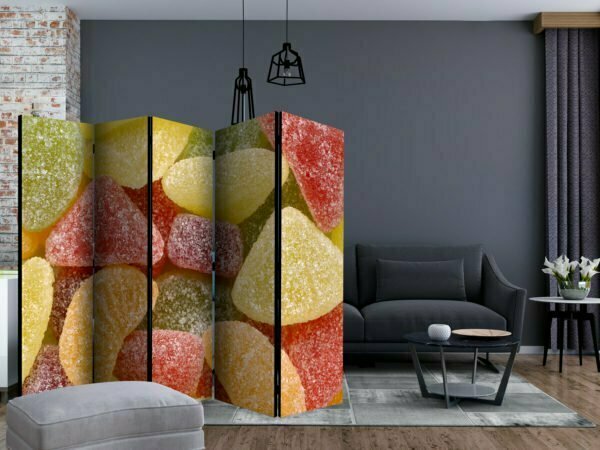 Dekoratives Paravent “Tasty fruit jellies II [Room Dividers]” ist ein besonderes Schmuckstück für die modernen Inneräume. 5-teilig, hergestellt aus Holz und beidseitig bedrucktes Paravent teilt nicht nur diskret den Raum sonder kreiert auch in dem Raum ein fabelhaftes Arrangement.