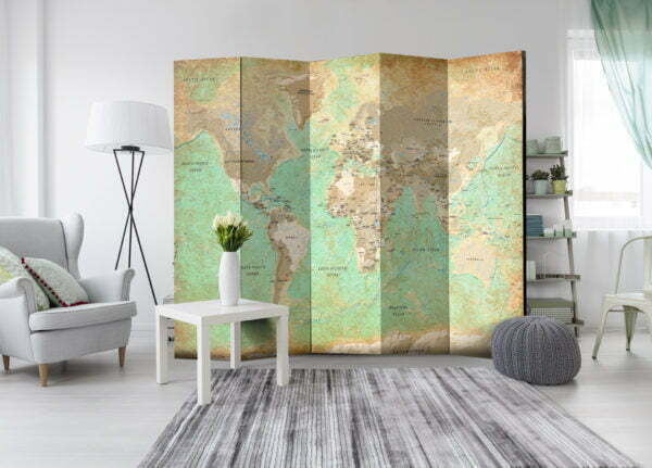 Dekoratives Paravent “Turquoise World Map [Room Dividers]” ist ein besonderes Schmuckstück für die modernen Inneräume. 5-teilig, hergestellt aus Holz und beidseitig bedrucktes Paravent teilt nicht nur diskret den Raum sonder kreiert auch in dem Raum ein fabelhaftes Arrangement.
