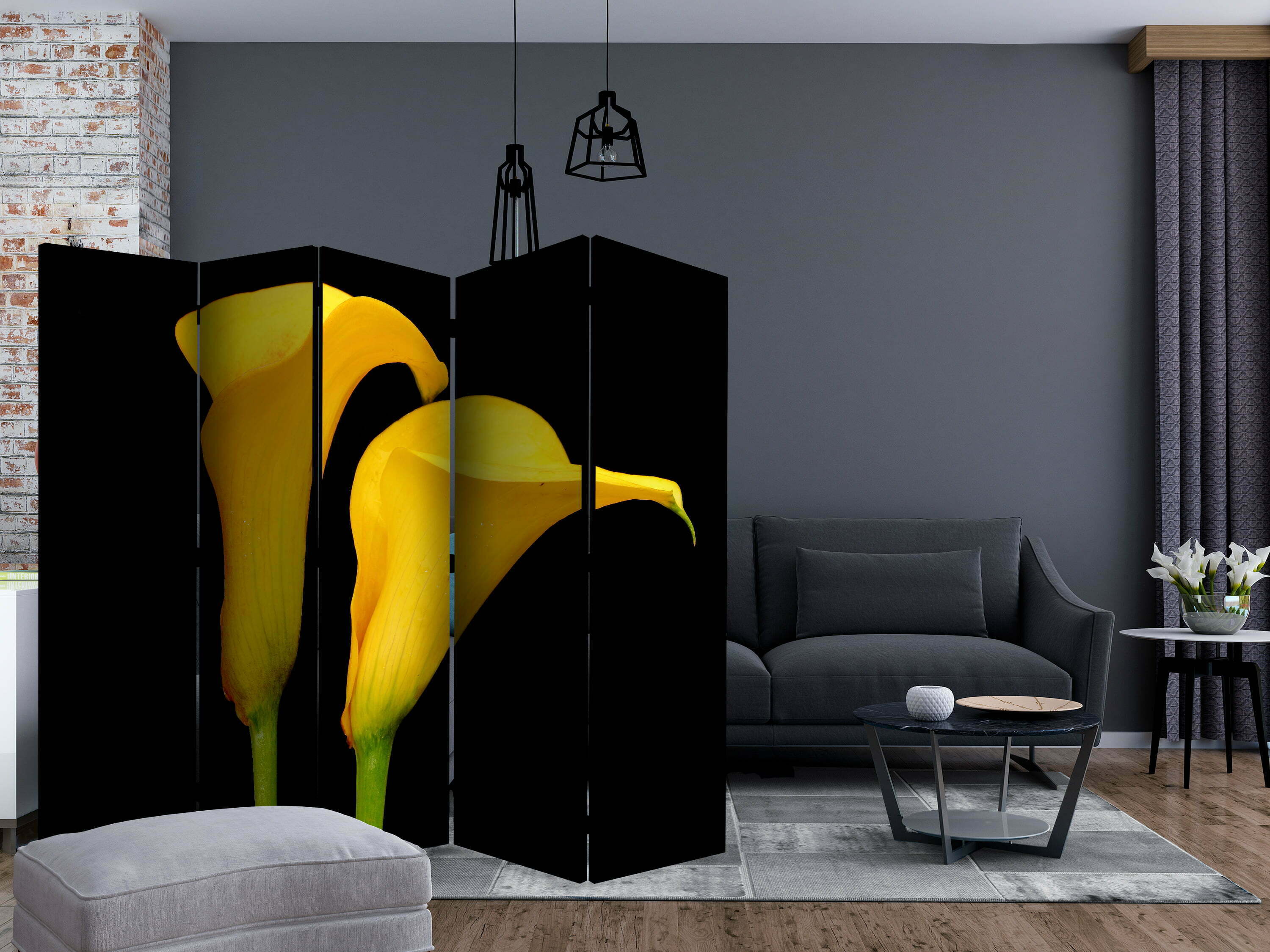 Be the first to review “5-teiliges Paravent – Two yellow calla flowers on a black background II [Room Dividers]”