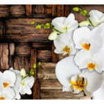 Widerstandsfähige, wasserabweisende und kratzfeste Vliestapete “Blooming orchids” zum Anbringen an die Wand. Fototapete “Blooming orchids” mit dem inspirierenden Motiv wird zum effektiven Zimmerschmuck jeden Raumes.