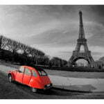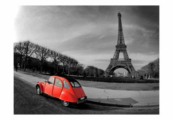 Fototapete – Der Eiffelturm und ein kleiner, roter Wagen