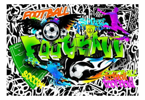Widerstandsfähige, wasserabweisende und kratzfeste Vliestapete “Football Graffiti” zum Anbringen an die Wand. Fototapete “Football Graffiti” mit dem inspirierenden Motiv wird zum effektiven Zimmerschmuck jeden Raumes.