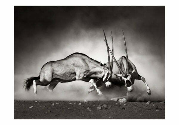 Widerstandsfähige, wasserabweisende und kratzfeste Vliestapete “Kampf der Antilopen” zum Anbringen an die Wand. Fototapete “Kampf der Antilopen” mit dem inspirierenden Motiv wird zum effektiven Zimmerschmuck jeden Raumes. Vliestapeten werden mittels Kleister an der Wand befestigt. Man kann sie in jedem Raum montieren sogar im Bad oder in der Küche. Vliestapete, halb-matte Beschichtung. 100% Vlies deckt kleine Unebenheiten der Wand ab. Sie schafft eine wärmedämmendene Isolierschicht und erlaubt den Wänden zu atmen. Wasserfester Druck ist sehr beständig.