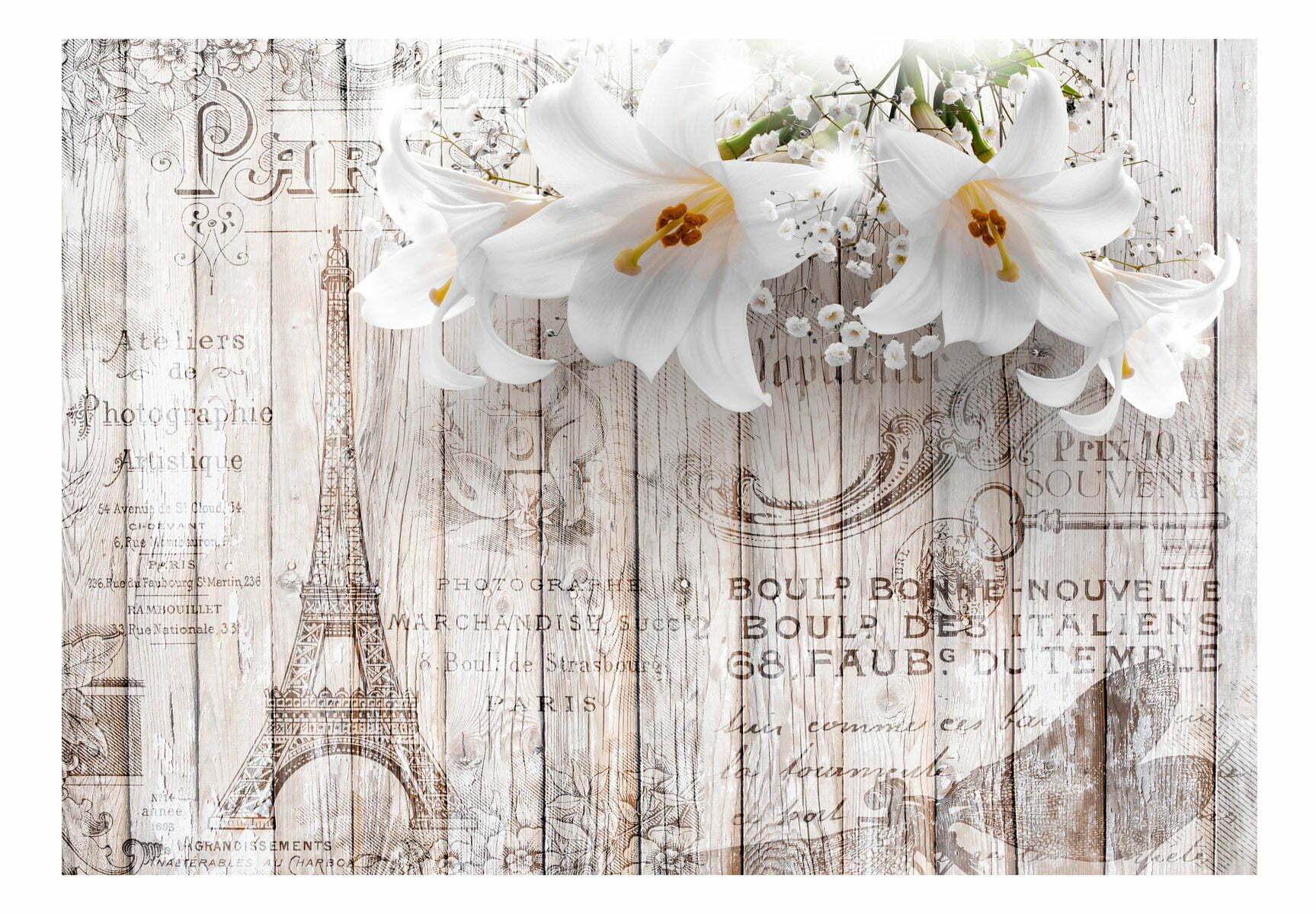 Widerstandsfähige, wasserabweisende und kratzfeste Vliestapete “Parisian Lilies” zum Anbringen an die Wand. Fototapete “Parisian Lilies” mit dem inspirierenden Motiv wird zum effektiven Zimmerschmuck jeden Raumes.