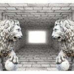 Widerstandsfähige, wasserabweisende und kratzfeste Vliestapete “Steinlöwen” zum Anbringen an die Wand. Fototapete “Steinlöwen” mit dem inspirierenden Motiv wird zum effektiven Zimmerschmuck jeden Raumes.