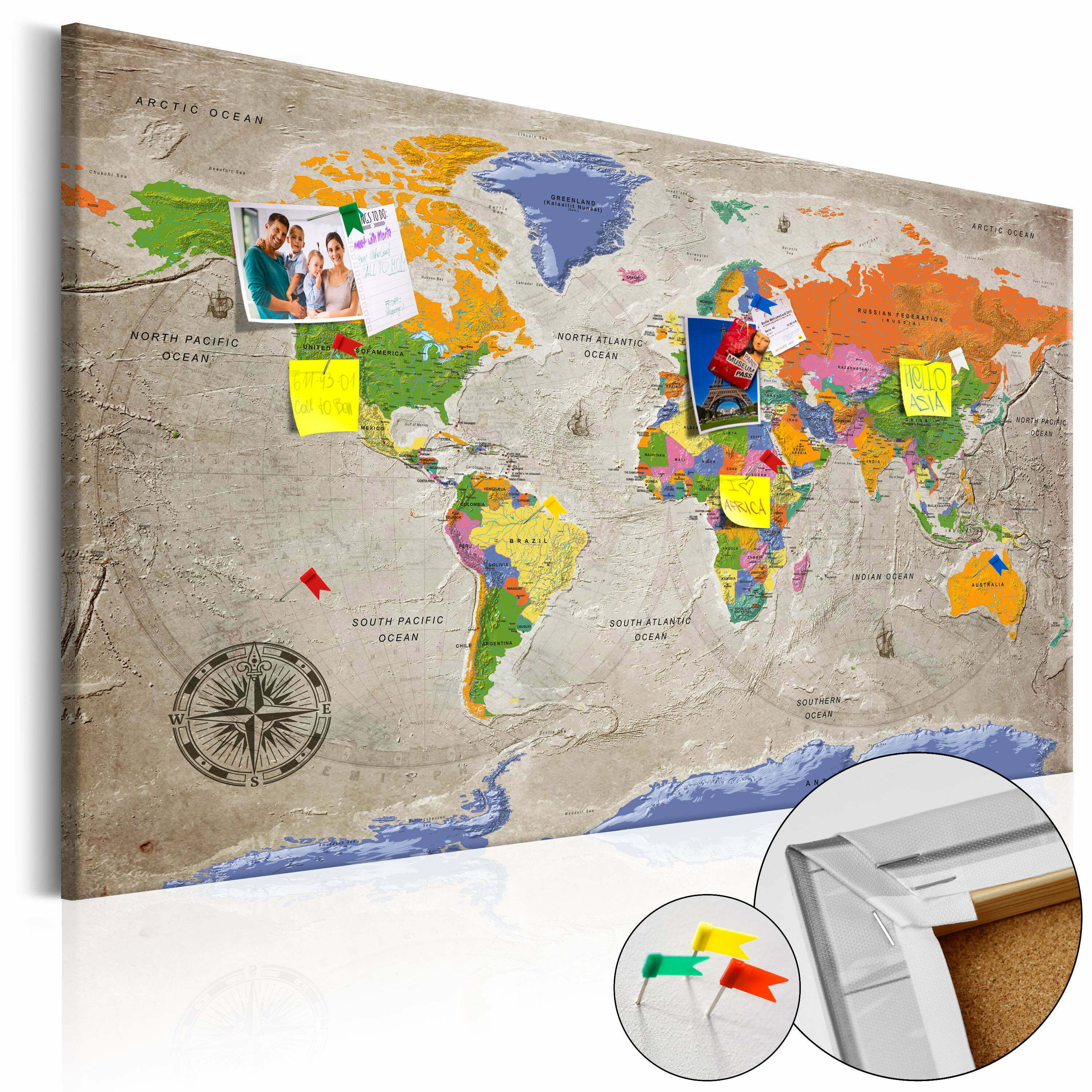 Pinnwand Bild “World Map: Retro Style [Cork Map]” ist ein Produkt für Personen die originelle Schmuckstücke für die Wand suchen. Ökologisches Material und interessantes Muster “World Map: Retro Style [Cork Map]” verursachen, dass die einfache Korktafel sich in ein stilvolles Accessoire verändert. Zu den Bildern auf Korken kann man Reißzwecken anheften und die besuchten Orte auf der Landkarte markieren oder Notizen anheften. Das Bild “World Map: Retro Style [Cork Map]” auf Kork ist viel leichter als die traditionellen Wanddekorationen. Dank dem können die dekorativen Korktafeln an jedem Platz in Deiner Wohnung oder Büro gehängt werden. Die Leinwand mit dem Ausdruck wird auf die Korktafel angebracht. Dank dem, charakterisiert sich der Aufdruck mit deutlichen Farben und gibt kleinste Details wieder. Stecke die Reißzwecken oder Notizen an und kreire Dein individuelles Muster auf Deiner Wand! Die Korklandkarte ist eine exzellente Idee als Geschenk für Reiseliebhaber!