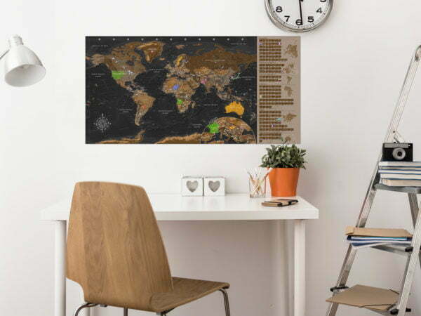 Halten Sie Ihre Reisen fest! Die Rubbel Weltkarte “Braune Weltkarte – Poster (Englische Beschriftung)” unterstreicht die Individualität Ihres Innenraumes und verleiht ihm einen einmaligen Charakter. Dank der speziellen, laminierten Oberfläche der Rubbel Weltkarte können Sie die Länder, die Sie bereits besucht haben, freirubbeln. Nach dem Freikratzen ausgewählter Orte wird die Rubbel Weltkarte auch zu einem fantastischen Kunststück in Ihrem Innenraum, da jedes Land eine andere Farbe hat und die gesamte Farbpalette der Rubbel Weltkarte von unseren Profis designt wurde.