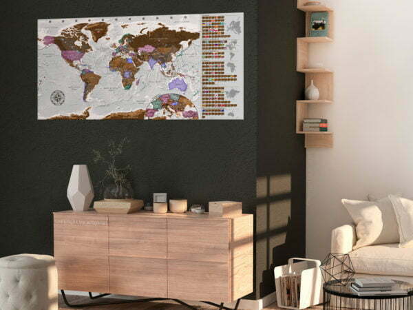 Halten Sie Ihre Reisen fest! Die Rubbel Weltkarte “Grau Weltkarte – Poster (Englische Beschriftung)” unterstreicht die Individualität Ihres Innenraumes und verleiht ihm einen einmaligen Charakter. Dank der speziellen, laminierten Oberfläche der Rubbel Weltkarte können Sie die Länder, die Sie bereits besucht haben, freirubbeln. Nach dem Freikratzen ausgewählter Orte wird die Rubbel Weltkarte auch zu einem fantastischen Kunststück in Ihrem Innenraum, da jedes Land eine andere Farbe hat und die gesamte Farbpalette der Rubbel Weltkarte von unseren Profis designt wurde.