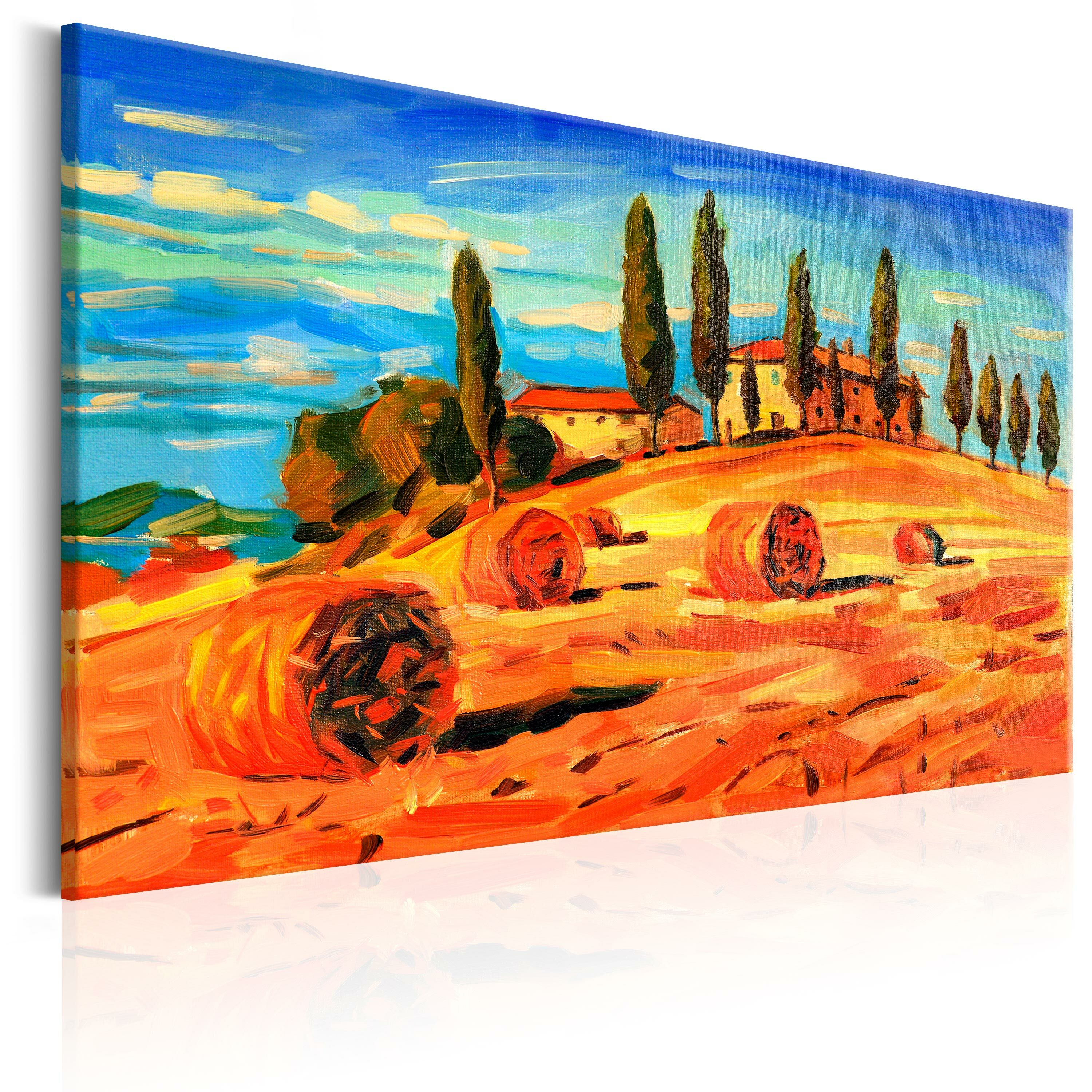 Materialien von bester Qualität Das Bild “August in Tuscany” ist auf spezieller Vlieseline-Leinwand gedruckt, die perfekt die Farben wiedergibt. Die Leinwand ist auf einen leichten, aber stabilen Rahmen gespannt, der aus umweltfreundlichen Materialien gefertigt ist. Für Dekorationen auf höchstem Niveau sorgt ein hochwertiger Druck, dank welchem die Farben ausdruckstark und die Details hervorragend abgebildet sind, unabhängig vom Format des Bildes.