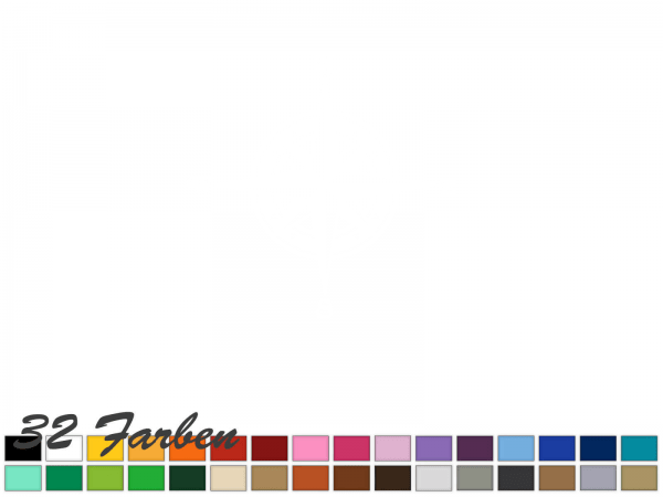| Farbe | Schwarz, Weiss, Gelb, Pastellorange, Orange, Rot, Dunkelrot, Hellrosa, Pink, Flieder, Lavendel, Violett, Hellblau, Enzian, Koenigsblau, Tuerkis, Mint, Hellgruen, Lindgruen, Gelbgruen, Dunkelgruen, Beige, Hellbraun, Haselnuss, Lehmbraun, Braun, Hellgrau, Grau, Dunkelgrau, Kupfer, Silber, Gold |