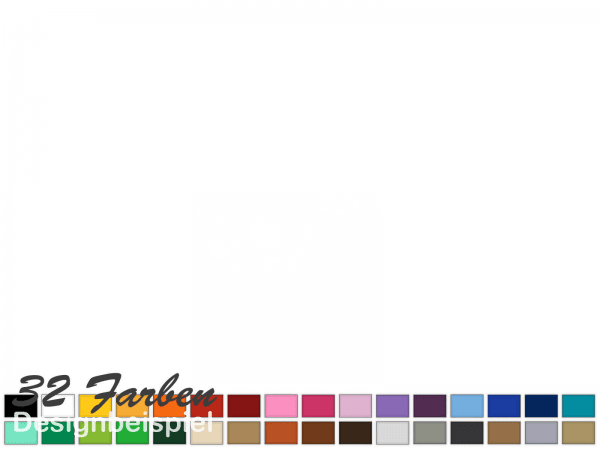 | Farbe | Schwarz, Weiss, Gelb, Pastellorange, Orange, Rot, Dunkelrot, Hellrosa, Pink, Flieder, Lavendel, Violett, Hellblau, Enzian, Koenigsblau, Tuerkis, Mint, Hellgruen, Lindgruen, Gelbgruen, Dunkelgruen, Beige, Hellbraun, Haselnuss, Lehmbraun, Braun, Hellgrau, Grau, Dunkelgrau, Kupfer, Silber, Gold |