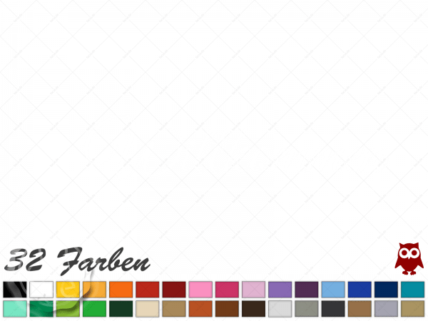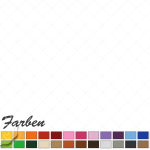 | Farbe | Schwarz, Weiss, Gelb, Pastellorange, Orange, Rot, Dunkelrot, Hellrosa, Pink, Flieder, Lavendel, Violett, Hellblau, Enzian, Koenigsblau, Tuerkis, Mint, Hellgruen, Lindgruen, Gelbgruen, Dunkelgruen, Beige, Hellbraun, Haselnuss, Lehmbraun, Braun, Hellgrau, Grau, Dunkelgrau, Kupfer, Silber, Gold |